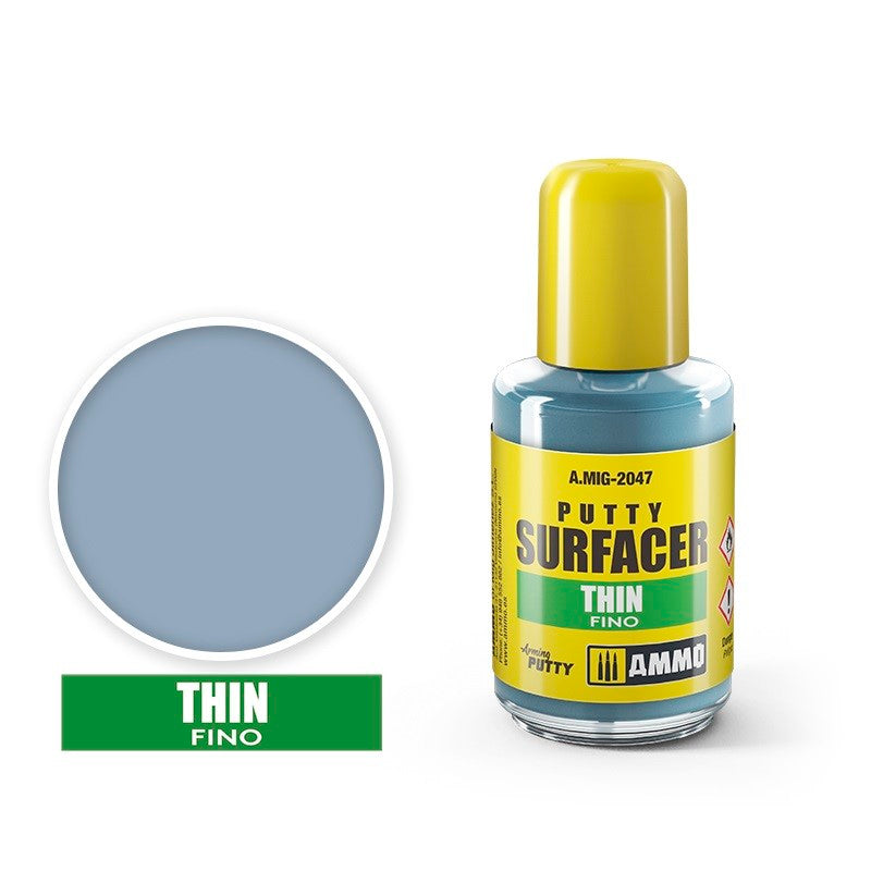 Mig Ammo 2047 Putty Surfacer – Thin is a liquid putty formulated with organic solvents, specially designed to fill small gaps and blemishes on your models. This putty will not shrink and can be sanded and painted once it has dried for 24 hours. Supplied in a 30ml bottle.