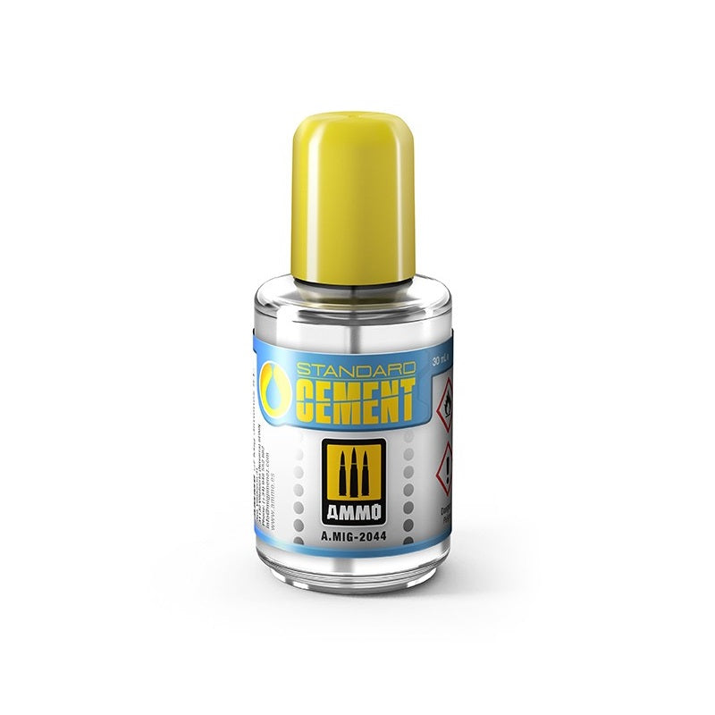 • Mig Ammo 2044 Standard Cement is a high-strength cement for use in assembling plastic scale models. The consistency lies between that of Mig’s Extra Thin Cement (A.MIG-2025) and Medium Density Cement (A.MIG-2038).