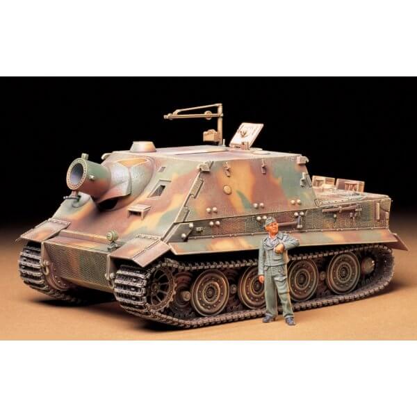 In the final stages of WWII, the Sturmtiger made its appearance on the battlefield. Based on the Tiger I hull, it came armed with a giant 38cm rocket launcher. The distinctive form of the Sturmtiger with its thick and short gun is now faithfully reproduced as a plastic assembly model kit. The main hatch on the superstructure can be depicted in either open or closed position, the rocket launcher and escape hatch are moveable even after assembly, the loading crane can also rotate, and the heaviness of the tracks is also realistically depicted. Also included in the set is one figure and four rockets.